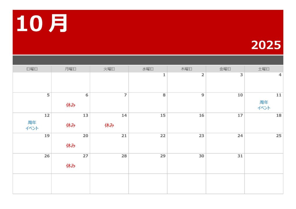 10月度の営業予定 2025年9月30日 tweet LINE はてブ 2025年10月の営業・休業予定は下記のとおりです。 10月11日には皆様のおかげで開店7周年を迎えます。周年記念の感謝の気持ちを込めて、11日・12日の週末2日間は立ち飲みイベントを開催させていただく予定です。各種のドリンクを記念特別価格でご提供させていただくほか、当日だけのお料理もご用意させていただきます。また恒例の感謝記念グッズのプレゼントも。詳細は追ってお知らせさせていただきますので、皆様のご来店を心よりお待ちいたしております。